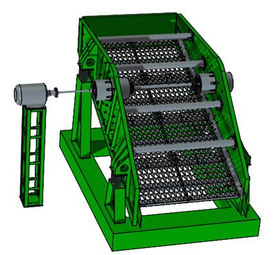 單軸振動(dòng)篩有一個(gè)十分牢靠的篩箱,因?yàn)槠浣Y(jié)構(gòu)是焊接及鉚接而成,在振動(dòng)器的主軸上不僅中間位置有偏心軸,而且主軸兩頭也有能夠調(diào)節(jié)的偏心輪。在篩分時(shí),電動(dòng)機(jī)經(jīng)由三角帶作用于振動(dòng)器,傳動(dòng)軸使偏心軸及偏心輪產(chǎn)生慣性力,這種慣性力會(huì)令篩箱作近似的圓形的運(yùn)動(dòng),使物料得到了佳的篩分效果。